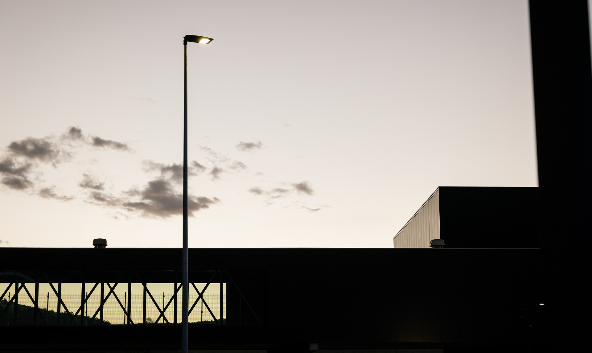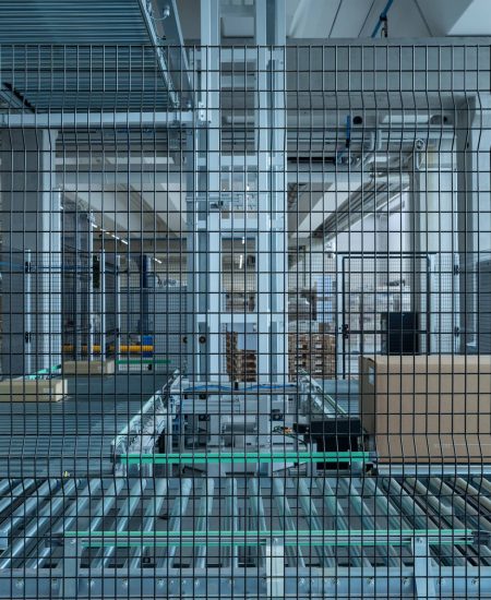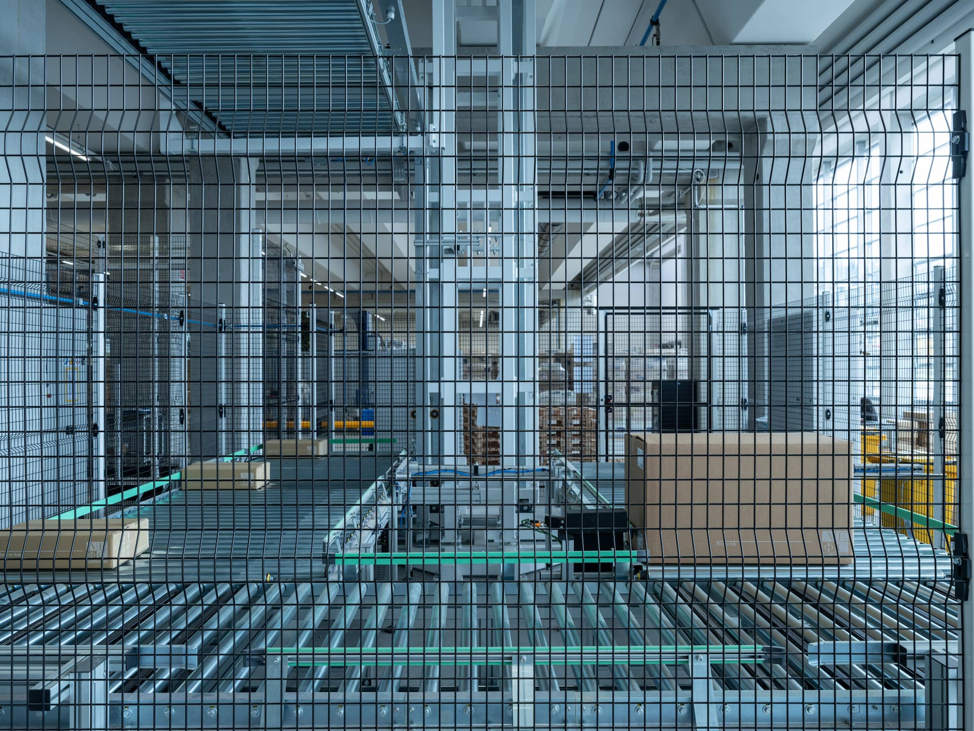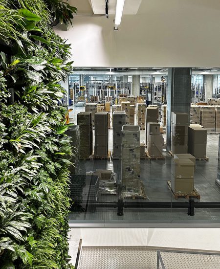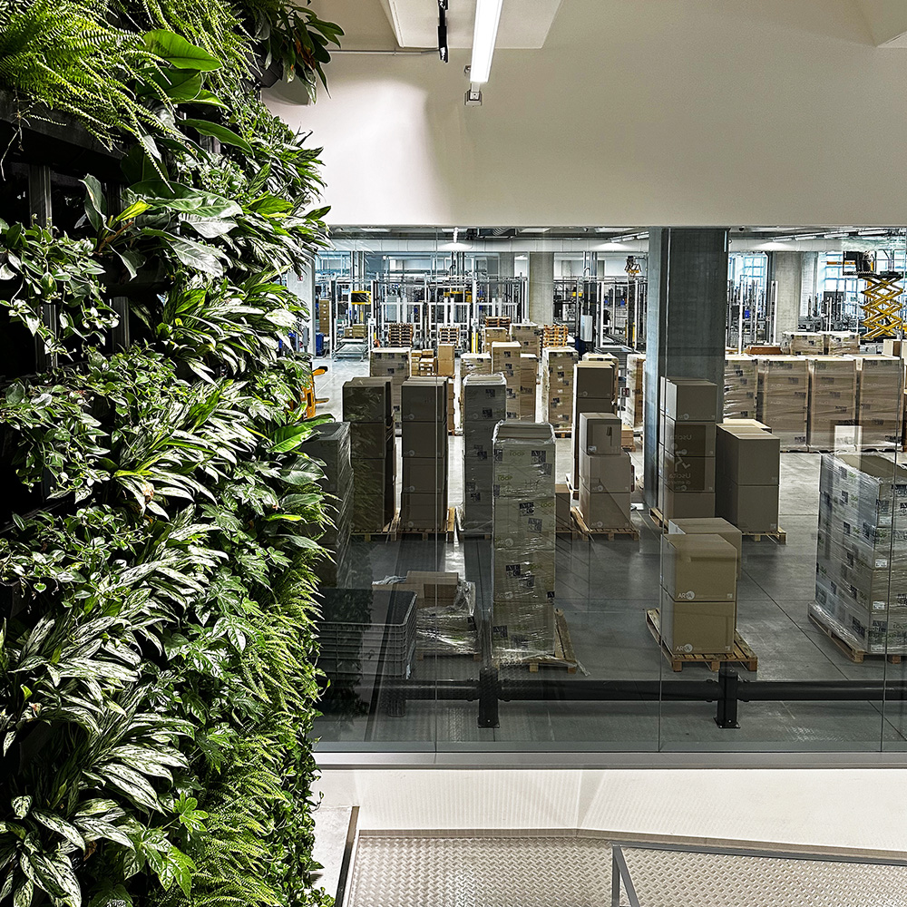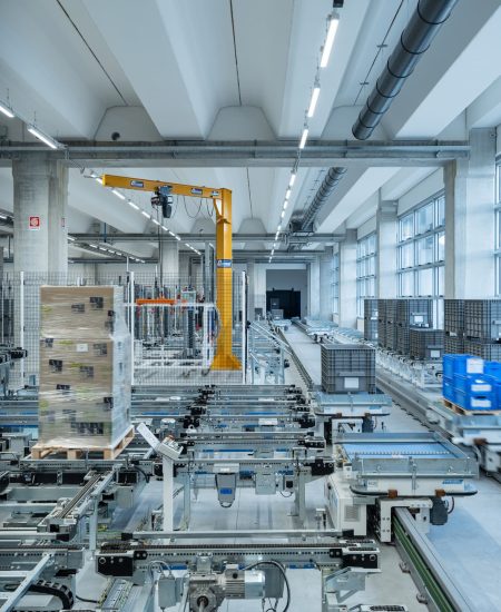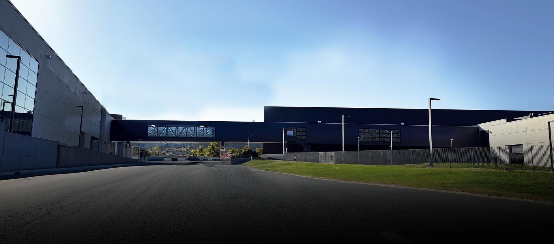 Logistikksenteret er koblet til hovedkontoret via en 100 meter lang suspendert industribro, et avgjørende element i logistikk-kjeden som sikrer kontinuerlig materialflyt mellom produksjonspunktene. Materialet hentes fra et automatisk lager og transporteres på spesialspor inne i broen, direkte til monteringslinjene i det nye anlegget, med energieffektiv LED utebelysning langs hele broen.