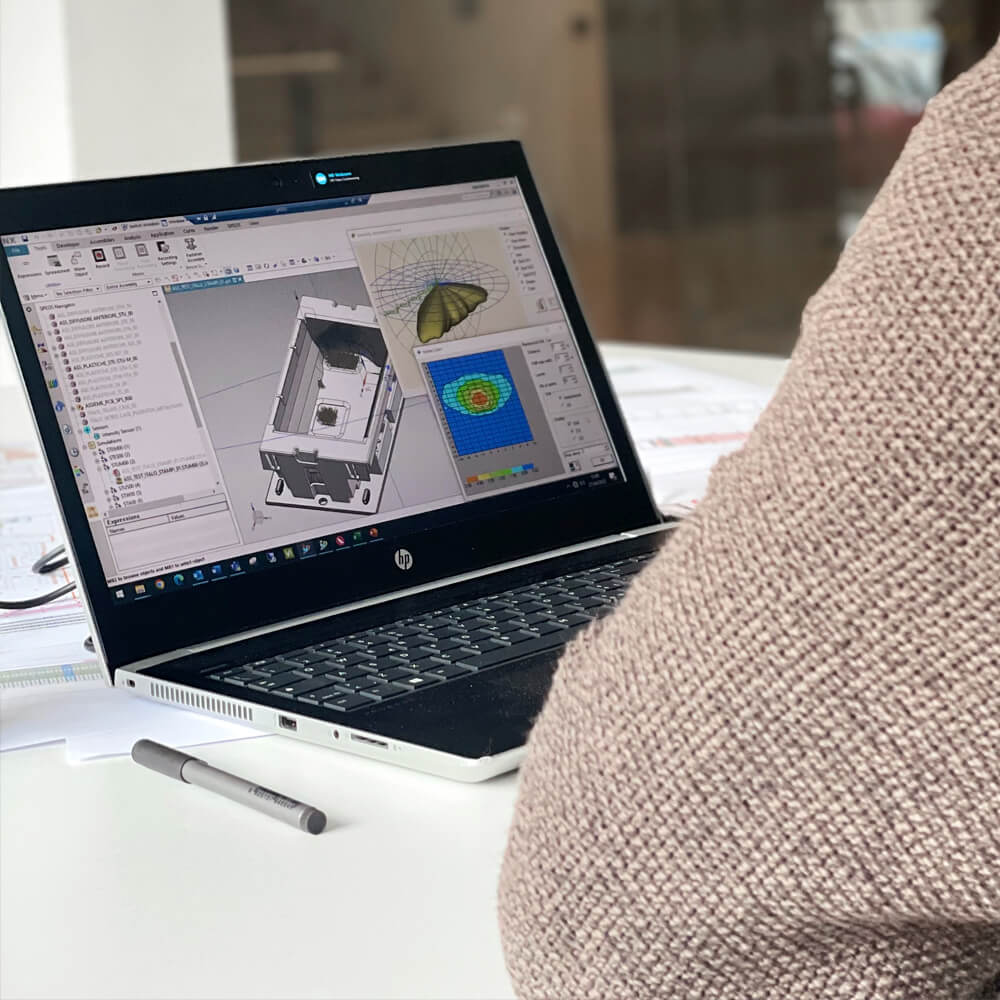 Utviklingsprosessen av optiske systemer i AECs FoU-team støttes av spesialisert simuleringsprogramvare. Programvaren gjør det mulig å gjenskape alle fysiske elementer som bidrar til lysutslipp og styring: LED-kilder, linser, reflektorer og glass kan modelleres ned til minste detalj.
