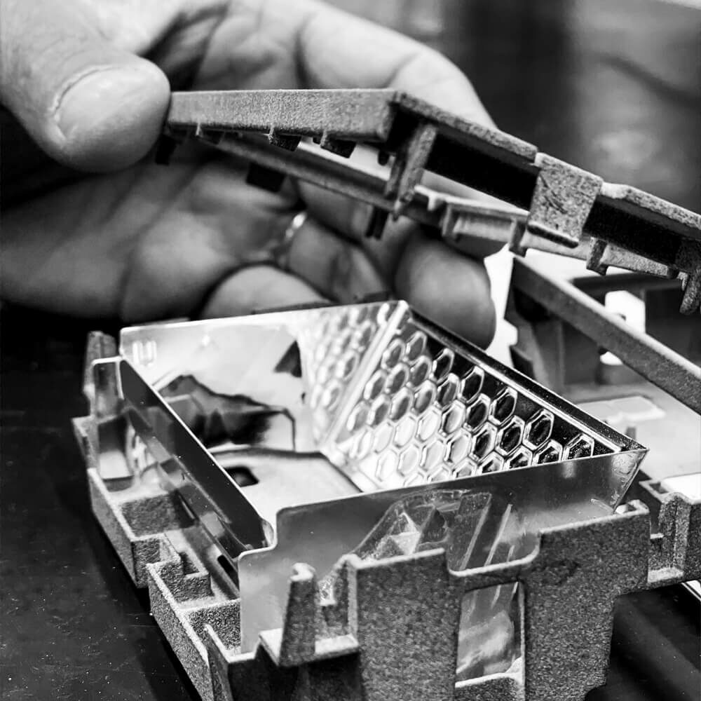I denne fasen lages stempelet ved hjelp av et 5-akset høyhastighets freseverk. Dette er en av de viktigste fasene, da den skaper den reflekterende delen av optikken. Prosessene utføres med spesielle hardmetallverktøy, etterfulgt av polering til speilblank overflate.