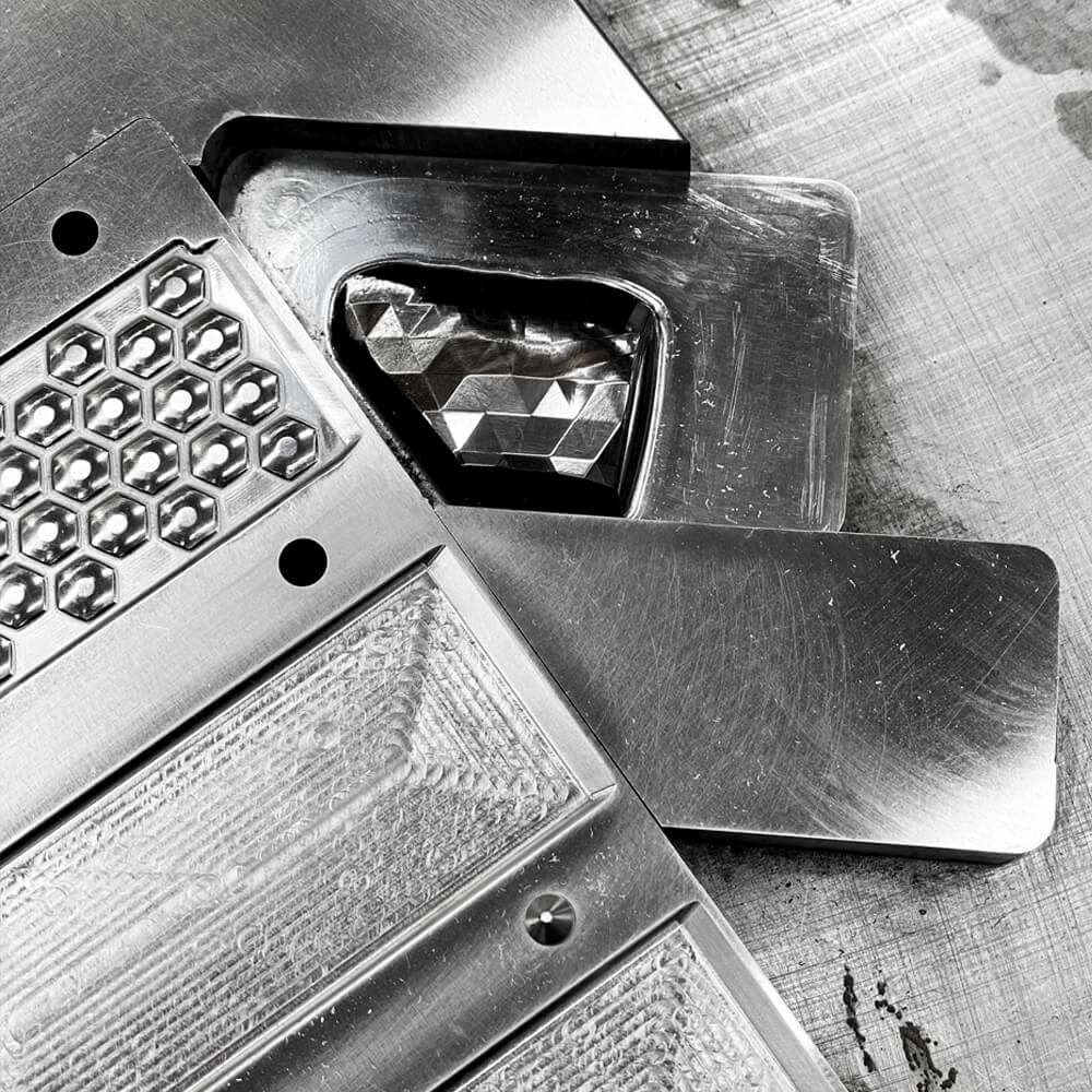 Bildet viser de perfekt polerte formflatene montert inne i klippeformen. De teknologiske egenskapene til disse pressene gir eksepsjonell støpeytelse og hastighet, og hele prosessen kontrolleres automatisert.