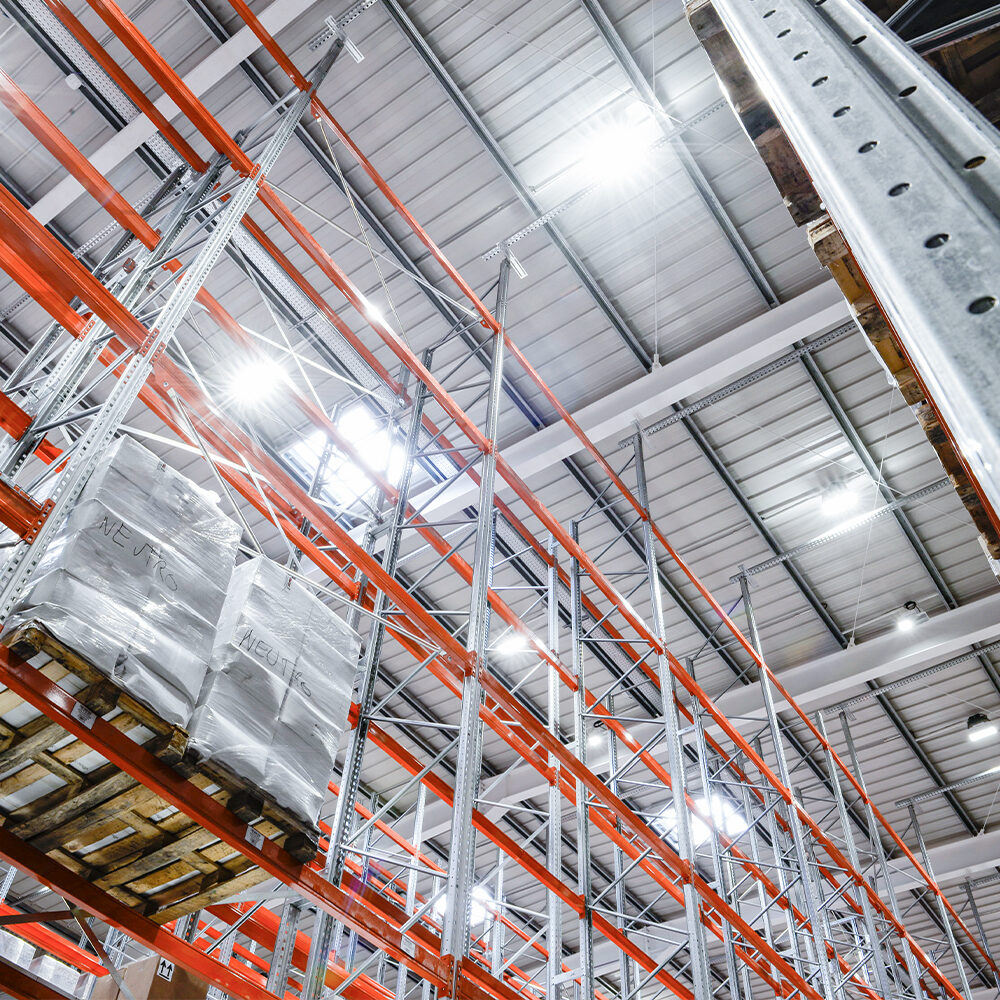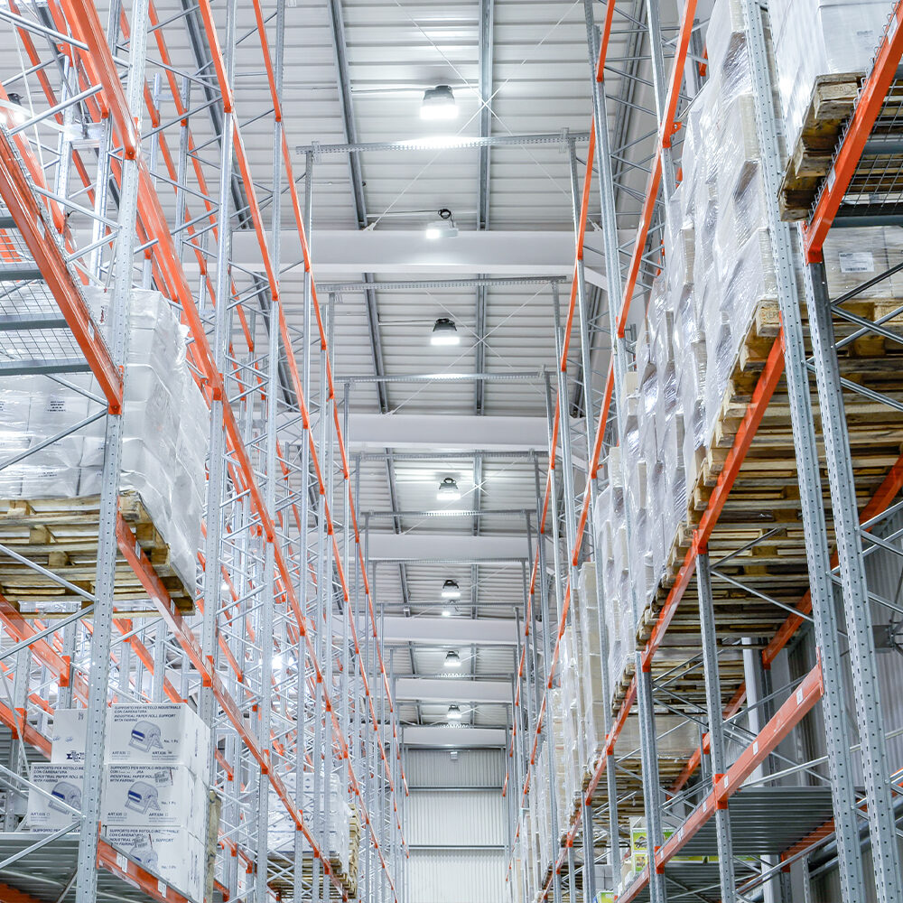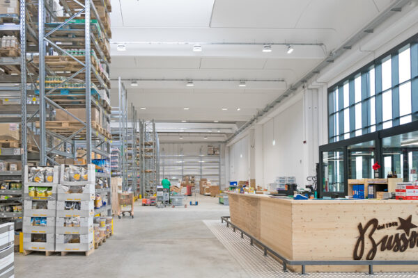 Oppdag den nye lagerbelysningen til Bussolini Distribuzione, utført med LED-armaturer for industribygg.