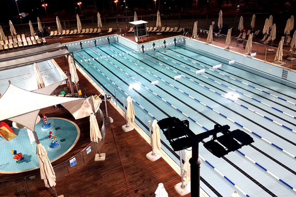 Offentlig svømmebasseng LED-belysning: AEC Illuminazione er valgt for den nye LED-belysningen av vakre Gordon Pool, et referansepunkt for svømmere i Tel Aviv. Dette svømmebassenget i OL-standard ligger ved vannkanten nær byens marina med sjøutsikt i bakgrunnen – en profesjonell struktur perfekt for trening og utsikt.