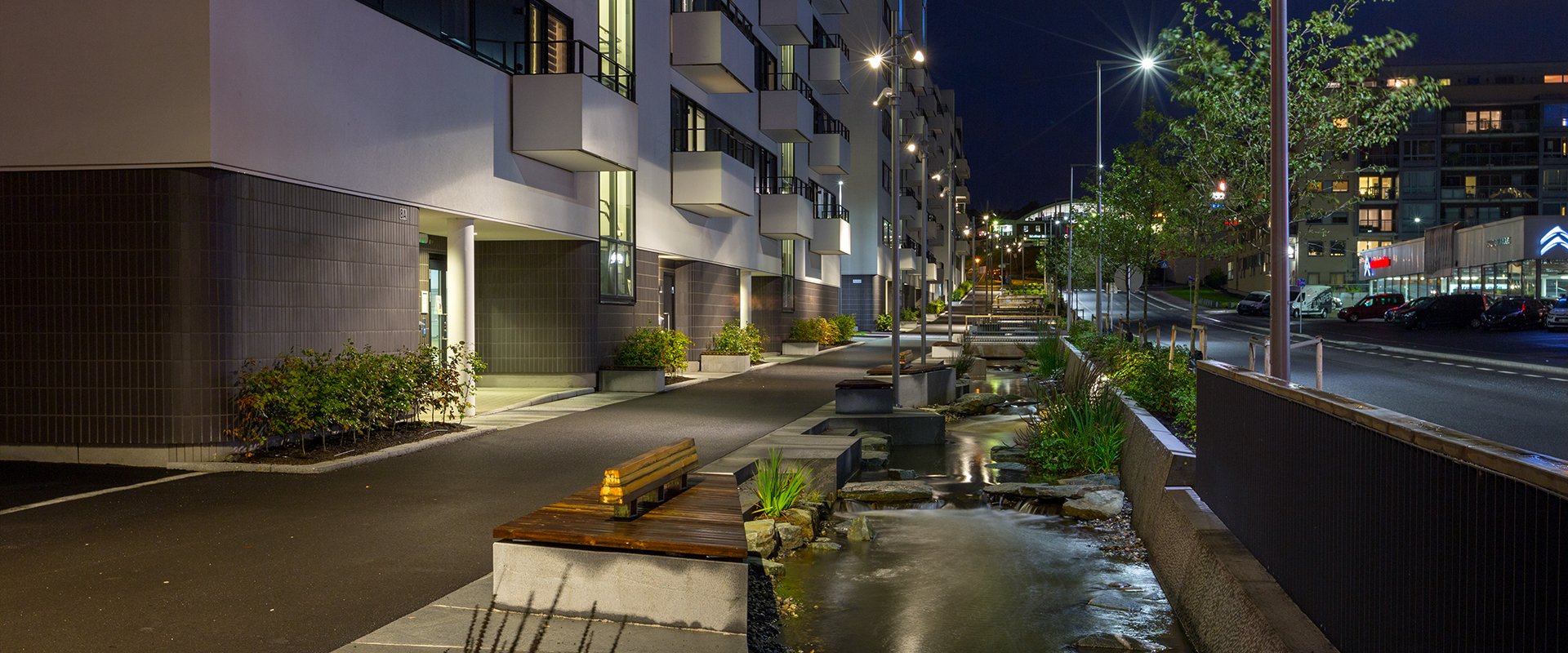 Takket være AECs løsninger for belysning av boligområdet Ensjø, var det mulig å fremheve den nye byarkitekturen, modulere lyset og fremheve de strukturelle egenskapene til de nye boligene.